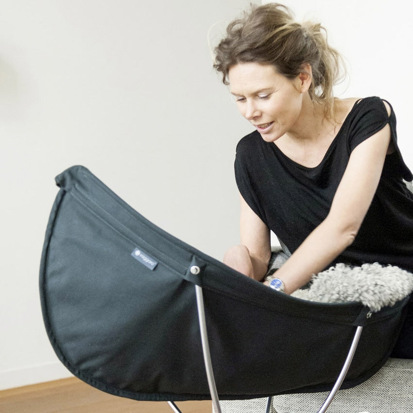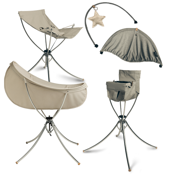 Vaggaro® is a patented frame with three textile seats: one cradle for the first few months of the newborn, one bouncer and one baby chair. That makes Vaggaro® a piece of furniture to grow in. It’s suitable for children between 0 and 3 years old. When your baby is too big for the bassinet, you use the same frame and change only the fabric to create the bouncer or the chair. With the adjustable height and quick folding technique you can use Vaggaro® wherever you are. Vaggaro® doesn’t take up more space than a folded umbrella and the light, folding stand (1.6 kgs) is easy to carry over your shoulder or place beneath the pram. Vaggaro® makes life easier for the parents at the same time as giving the little ones a safe and comfortable seat where they can feel at home, regardless of location. The stylish Scandinavian design ensures that it fits easily into all environments and is attractive to have in the room, even when not in use.